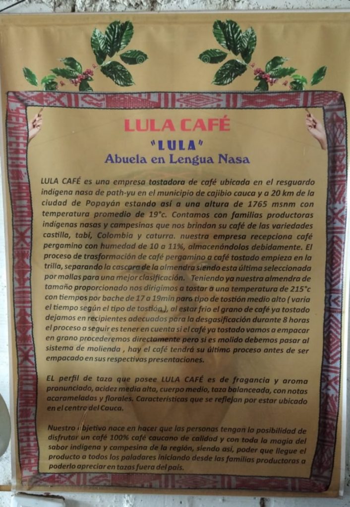 “Lula” stands for “grandmother” in the Nasa language. Lula Café is a coffee roasting company located in the Nada de Path -yu indigenous reservation in the municipality of Cajibio, Cauca and 20 km from the city of Popayán, being thus at an altitude of 1765 meters above sea level with an average temperature of 19 ° C. We have families Nasas and peasant indigenous producers who offer us their coffee in the: